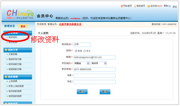 - 2. 点击左侧导航栏目中“会员资料”栏目下面的子栏目“修改资料”.